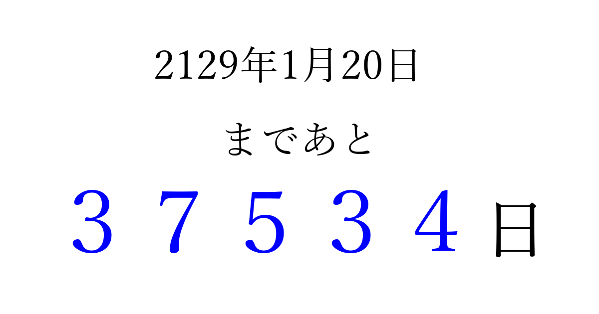 2129年1月20日(木)まで あと 99999 日です 追加すると、トップページからすぐ選べるようになります ※2026/04/16現在の結果です。 最新の状態に更新する ↓シェアして、タイムライン上にカウントダウンを表示しよう!↓ 📤 この結果を共有する Tweet シェア Threads Bluesky 別の日付でカウントダウン 2129年1月のカレンダー このページをブックマークに追加すると、いつでもカウントダウンを確認できます。 (PC: Ctrl+D / Mac: ⌘+D) hitome-notes.comでは以下のページも運営しています。 指定日と期間から日付を計算 | ガチャ確率計算・シミュレーション | プライバシー・ポリシー 運営者:Avocado