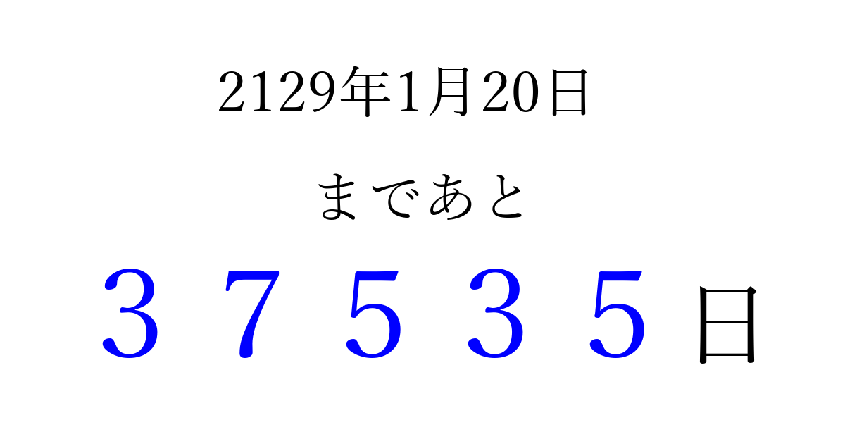 2129年1月20日(木)まで あと 99999 日です 追加すると、トップページからすぐ選べるようになります ※2026/04/15現在の結果です。 最新の状態に更新する ↓シェアして、タイムライン上にカウントダウンを表示しよう!↓ 📤 この結果を共有する Tweet シェア Threads Bluesky 別の日付でカウントダウン 2129年1月のカレンダー このページをブックマークに追加すると、いつでもカウントダウンを確認できます。 (PC: Ctrl+D / Mac: ⌘+D) hitome-notes.comでは以下のページも運営しています。 指定日と期間から日付を計算 | ガチャ確率計算・シミュレーション | プライバシー・ポリシー 運営者:Avocado