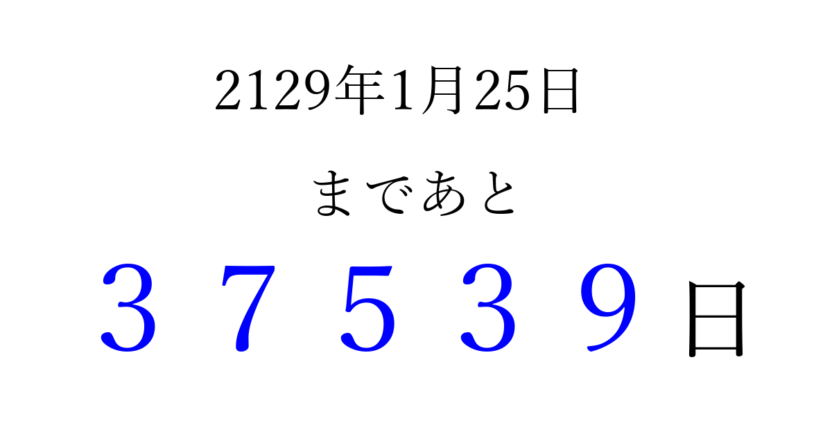 2129年1月25日(火)まで あと 99999 日です 追加すると、トップページからすぐ選べるようになります ※2026/04/16現在の結果です。 最新の状態に更新する ↓シェアして、タイムライン上にカウントダウンを表示しよう!↓ 📤 この結果を共有する Tweet シェア Threads Bluesky 別の日付でカウントダウン 2129年1月のカレンダー このページをブックマークに追加すると、いつでもカウントダウンを確認できます。 (PC: Ctrl+D / Mac: ⌘+D) hitome-notes.comでは以下のページも運営しています。 指定日と期間から日付を計算 | ガチャ確率計算・シミュレーション | プライバシー・ポリシー 運営者:Avocado