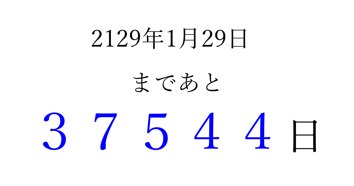 2129年1月29日(土)まで あと 99999 日です 追加すると、トップページからすぐ選べるようになります ※2026/04/15現在の結果です。 最新の状態に更新する ↓シェアして、タイムライン上にカウントダウンを表示しよう!↓ 📤 この結果を共有する Tweet シェア Threads Bluesky 別の日付でカウントダウン 2129年1月のカレンダー このページをブックマークに追加すると、いつでもカウントダウンを確認できます。 (PC: Ctrl+D / Mac: ⌘+D) hitome-notes.comでは以下のページも運営しています。 指定日と期間から日付を計算 | ガチャ確率計算・シミュレーション | プライバシー・ポリシー 運営者:Avocado
