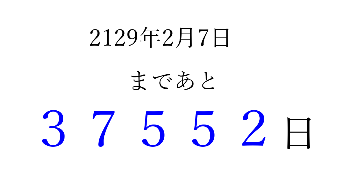 2129年2月7日(月)まで あと 99999 日です 追加すると、トップページからすぐ選べるようになります ※2026/04/16現在の結果です。 最新の状態に更新する ↓シェアして、タイムライン上にカウントダウンを表示しよう!↓ 📤 この結果を共有する Tweet シェア Threads Bluesky 別の日付でカウントダウン 2129年2月のカレンダー このページをブックマークに追加すると、いつでもカウントダウンを確認できます。 (PC: Ctrl+D / Mac: ⌘+D) hitome-notes.comでは以下のページも運営しています。 指定日と期間から日付を計算 | ガチャ確率計算・シミュレーション | プライバシー・ポリシー 運営者:Avocado