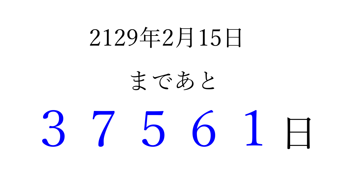 2129年2月15日(火)まで あと 99999 日です 追加すると、トップページからすぐ選べるようになります ※2026/04/15現在の結果です。 最新の状態に更新する ↓シェアして、タイムライン上にカウントダウンを表示しよう!↓ 📤 この結果を共有する Tweet シェア Threads Bluesky 別の日付でカウントダウン 2129年2月のカレンダー このページをブックマークに追加すると、いつでもカウントダウンを確認できます。 (PC: Ctrl+D / Mac: ⌘+D) hitome-notes.comでは以下のページも運営しています。 指定日と期間から日付を計算 | ガチャ確率計算・シミュレーション | プライバシー・ポリシー 運営者:Avocado