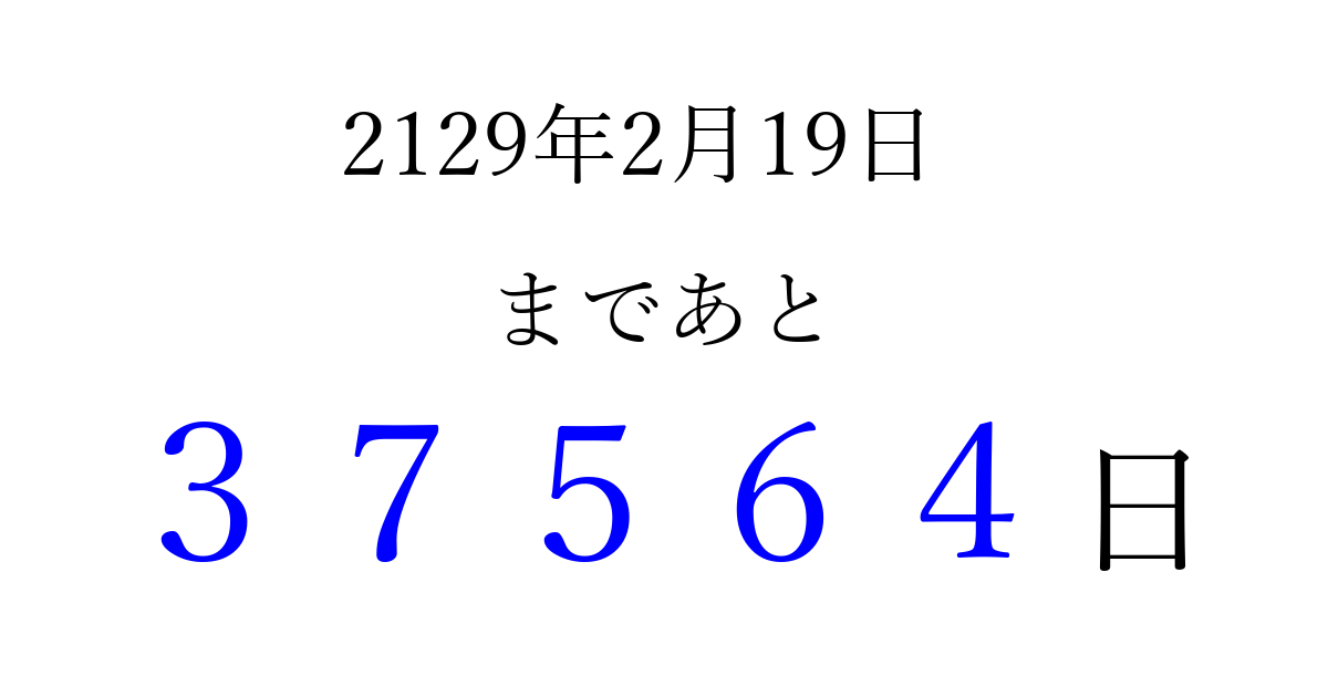 2129年2月19日(土)まで あと 99999 日です 追加すると、トップページからすぐ選べるようになります ※2026/04/16現在の結果です。 最新の状態に更新する ↓シェアして、タイムライン上にカウントダウンを表示しよう!↓ 📤 この結果を共有する Tweet シェア Threads Bluesky 別の日付でカウントダウン 2129年2月のカレンダー このページをブックマークに追加すると、いつでもカウントダウンを確認できます。 (PC: Ctrl+D / Mac: ⌘+D) hitome-notes.comでは以下のページも運営しています。 指定日と期間から日付を計算 | ガチャ確率計算・シミュレーション | プライバシー・ポリシー 運営者:Avocado