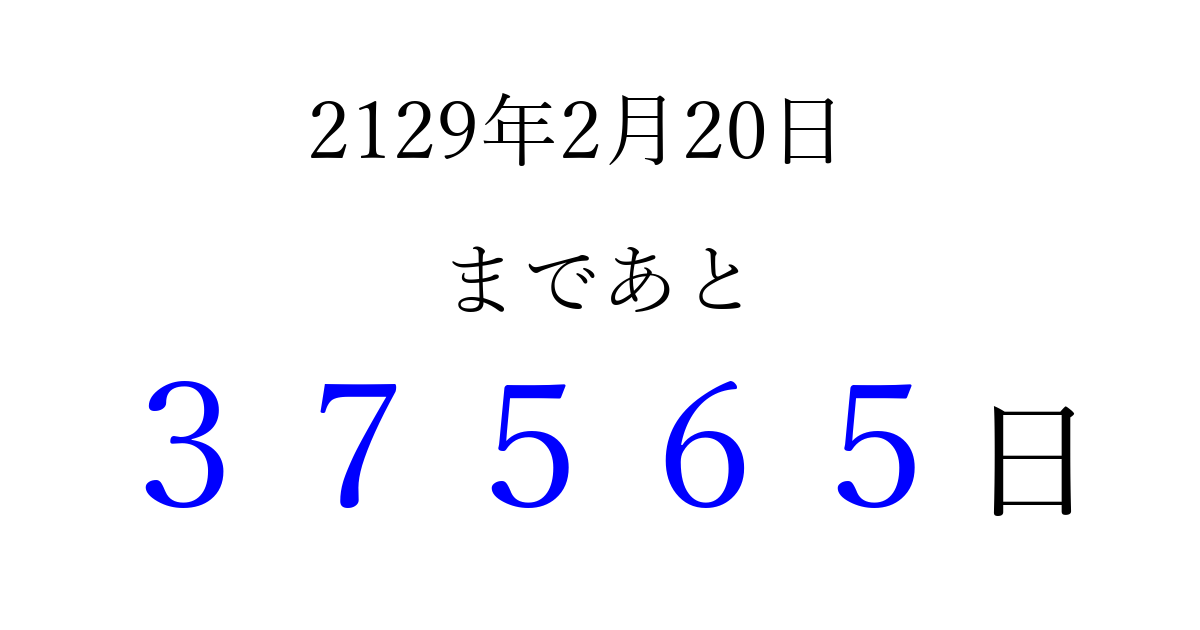 2129年2月20日(日)まで あと 99999 日です 追加すると、トップページからすぐ選べるようになります ※2026/04/16現在の結果です。 最新の状態に更新する ↓シェアして、タイムライン上にカウントダウンを表示しよう!↓ 📤 この結果を共有する Tweet シェア Threads Bluesky 別の日付でカウントダウン 2129年2月のカレンダー このページをブックマークに追加すると、いつでもカウントダウンを確認できます。 (PC: Ctrl+D / Mac: ⌘+D) hitome-notes.comでは以下のページも運営しています。 指定日と期間から日付を計算 | ガチャ確率計算・シミュレーション | プライバシー・ポリシー 運営者:Avocado