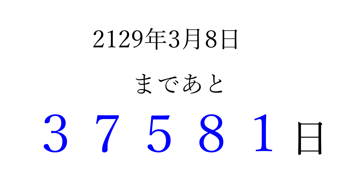 2129年3月8日(火)まで あと 99999 日です 追加すると、トップページからすぐ選べるようになります ※2026/04/16現在の結果です。 最新の状態に更新する ↓シェアして、タイムライン上にカウントダウンを表示しよう!↓ 📤 この結果を共有する Tweet シェア Threads Bluesky 別の日付でカウントダウン 2129年3月のカレンダー このページをブックマークに追加すると、いつでもカウントダウンを確認できます。 (PC: Ctrl+D / Mac: ⌘+D) hitome-notes.comでは以下のページも運営しています。 指定日と期間から日付を計算 | ガチャ確率計算・シミュレーション | プライバシー・ポリシー 運営者:Avocado