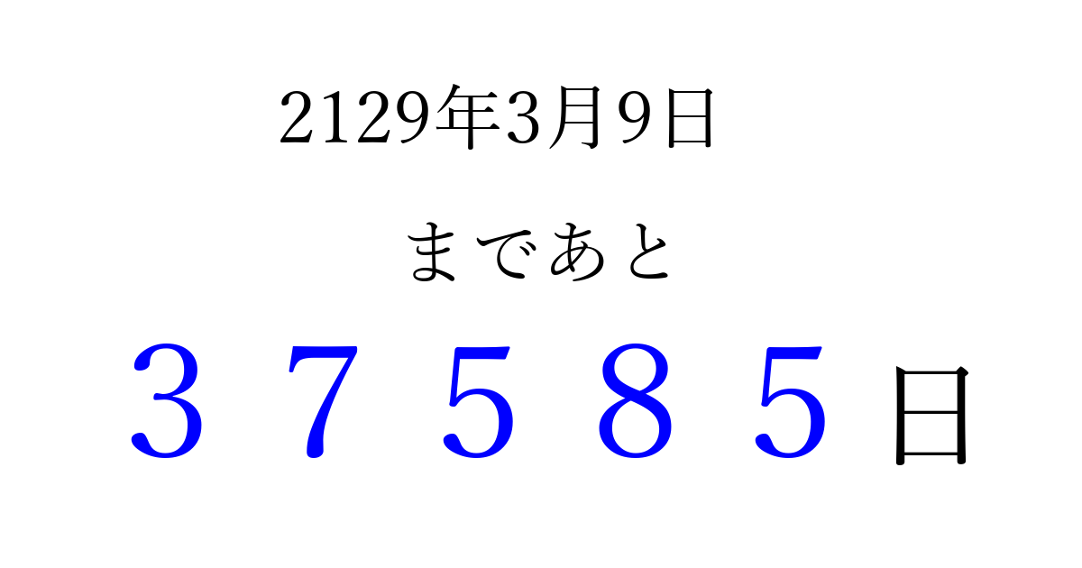 2129年3月9日(水)まで あと 99999 日です 追加すると、トップページからすぐ選べるようになります ※2026/04/13現在の結果です。 最新の状態に更新する ↓シェアして、タイムライン上にカウントダウンを表示しよう!↓ 📤 この結果を共有する Tweet シェア Threads Bluesky 別の日付でカウントダウン 2129年3月のカレンダー このページをブックマークに追加すると、いつでもカウントダウンを確認できます。 (PC: Ctrl+D / Mac: ⌘+D) hitome-notes.comでは以下のページも運営しています。 指定日と期間から日付を計算 | ガチャ確率計算・シミュレーション | プライバシー・ポリシー 運営者:Avocado