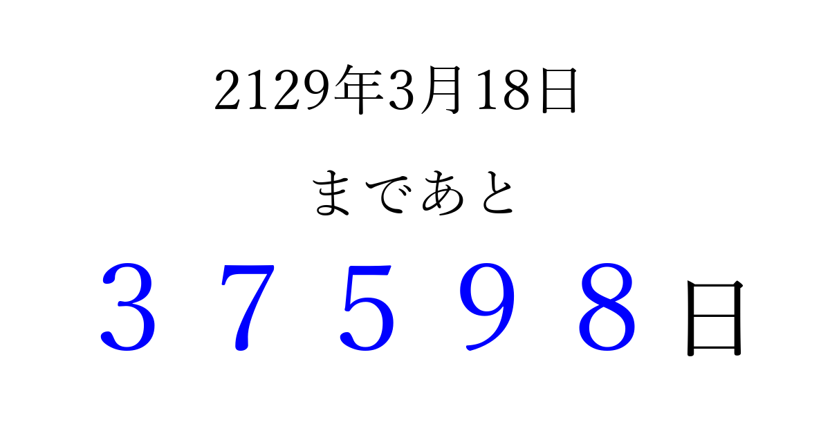 2129年3月18日(金)まで あと 99999 日です 追加すると、トップページからすぐ選べるようになります ※2026/04/09現在の結果です。 最新の状態に更新する ↓シェアして、タイムライン上にカウントダウンを表示しよう!↓ 📤 この結果を共有する Tweet シェア Threads Bluesky 別の日付でカウントダウン 2129年3月のカレンダー このページをブックマークに追加すると、いつでもカウントダウンを確認できます。 (PC: Ctrl+D / Mac: ⌘+D) hitome-notes.comでは以下のページも運営しています。 指定日と期間から日付を計算 | ガチャ確率計算・シミュレーション | プライバシー・ポリシー 運営者:Avocado