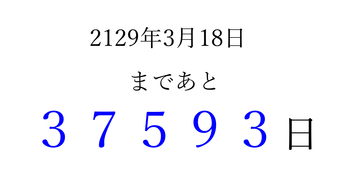 2129年3月18日(金)まで あと 99999 日です 追加すると、トップページからすぐ選べるようになります ※2026/04/14現在の結果です。 最新の状態に更新する ↓シェアして、タイムライン上にカウントダウンを表示しよう!↓ 📤 この結果を共有する Tweet シェア Threads Bluesky 別の日付でカウントダウン 2129年3月のカレンダー このページをブックマークに追加すると、いつでもカウントダウンを確認できます。 (PC: Ctrl+D / Mac: ⌘+D) hitome-notes.comでは以下のページも運営しています。 指定日と期間から日付を計算 | ガチャ確率計算・シミュレーション | プライバシー・ポリシー 運営者:Avocado