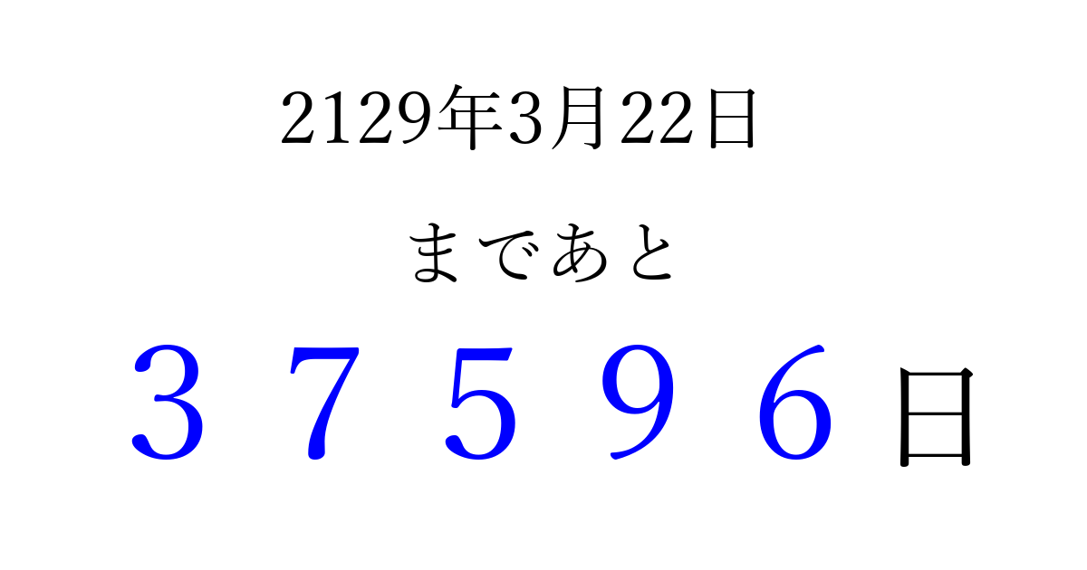 2129年3月22日(火)まで あと 99999 日です 追加すると、トップページからすぐ選べるようになります ※2026/04/15現在の結果です。 最新の状態に更新する ↓シェアして、タイムライン上にカウントダウンを表示しよう!↓ 📤 この結果を共有する Tweet シェア Threads Bluesky 別の日付でカウントダウン 2129年3月のカレンダー このページをブックマークに追加すると、いつでもカウントダウンを確認できます。 (PC: Ctrl+D / Mac: ⌘+D) hitome-notes.comでは以下のページも運営しています。 指定日と期間から日付を計算 | ガチャ確率計算・シミュレーション | プライバシー・ポリシー 運営者:Avocado