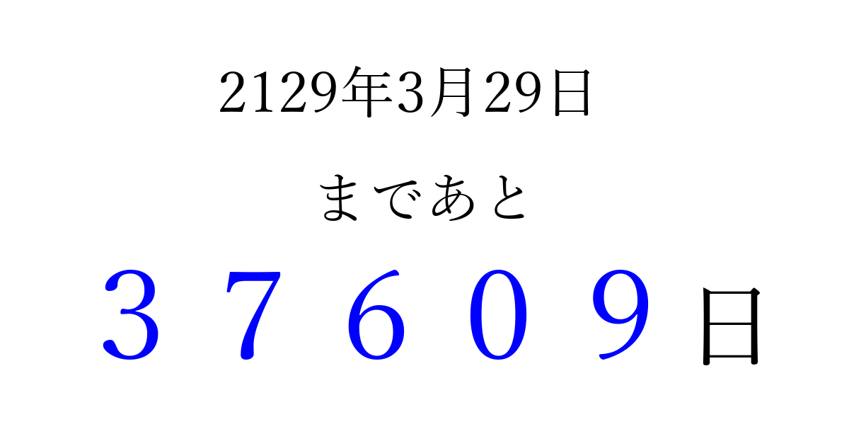 2129年3月29日(火)まで あと 99999 日です 追加すると、トップページからすぐ選べるようになります ※2026/04/09現在の結果です。 最新の状態に更新する ↓シェアして、タイムライン上にカウントダウンを表示しよう!↓ 📤 この結果を共有する Tweet シェア Threads Bluesky 別の日付でカウントダウン 2129年3月のカレンダー このページをブックマークに追加すると、いつでもカウントダウンを確認できます。 (PC: Ctrl+D / Mac: ⌘+D) hitome-notes.comでは以下のページも運営しています。 指定日と期間から日付を計算 | ガチャ確率計算・シミュレーション | プライバシー・ポリシー 運営者:Avocado