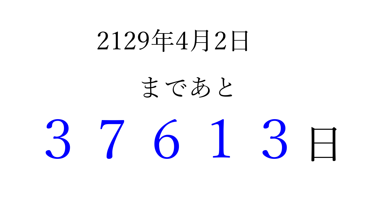 2129年4月2日(土)まで あと 99999 日です 追加すると、トップページからすぐ選べるようになります ※2026/04/09現在の結果です。 最新の状態に更新する ↓シェアして、タイムライン上にカウントダウンを表示しよう!↓ 📤 この結果を共有する Tweet シェア Threads Bluesky 別の日付でカウントダウン 2129年4月のカレンダー このページをブックマークに追加すると、いつでもカウントダウンを確認できます。 (PC: Ctrl+D / Mac: ⌘+D) hitome-notes.comでは以下のページも運営しています。 指定日と期間から日付を計算 | ガチャ確率計算・シミュレーション | プライバシー・ポリシー 運営者:Avocado