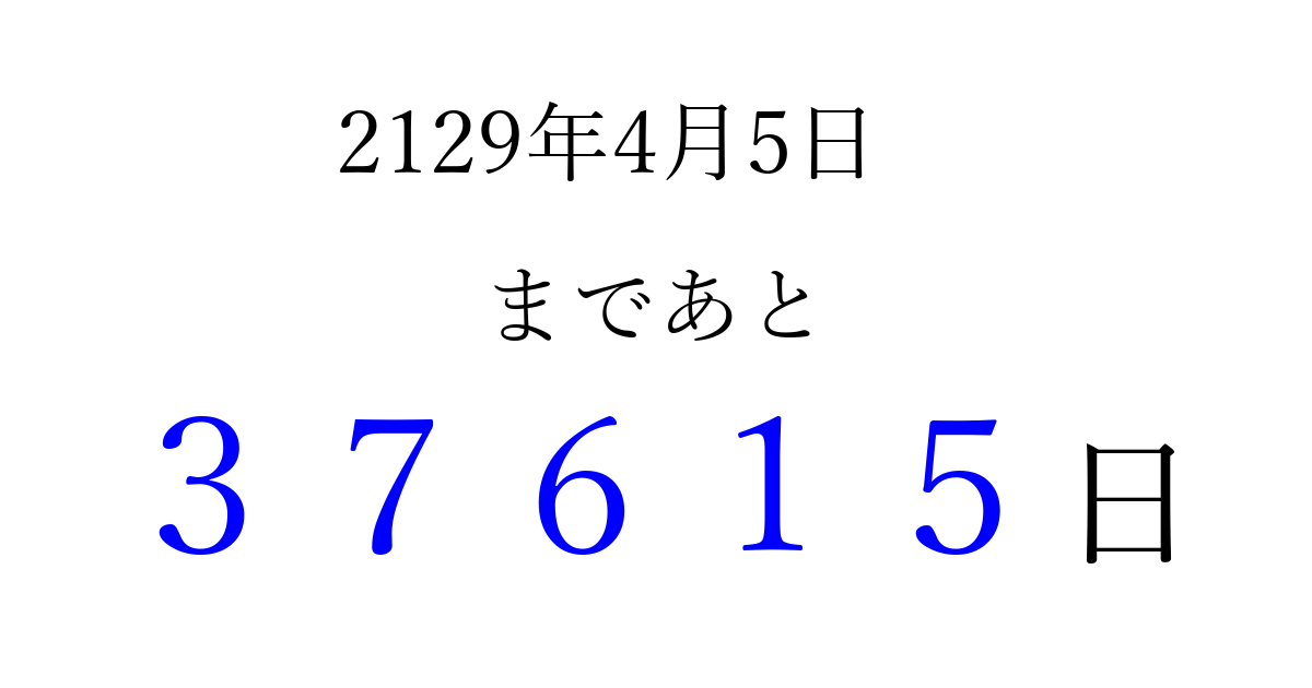 2129年4月5日(火)まで あと 99999 日です 追加すると、トップページからすぐ選べるようになります ※2026/04/10現在の結果です。 最新の状態に更新する ↓シェアして、タイムライン上にカウントダウンを表示しよう!↓ 📤 この結果を共有する Tweet シェア Threads Bluesky 別の日付でカウントダウン 2129年4月のカレンダー このページをブックマークに追加すると、いつでもカウントダウンを確認できます。 (PC: Ctrl+D / Mac: ⌘+D) hitome-notes.comでは以下のページも運営しています。 指定日と期間から日付を計算 | ガチャ確率計算・シミュレーション | プライバシー・ポリシー 運営者:Avocado