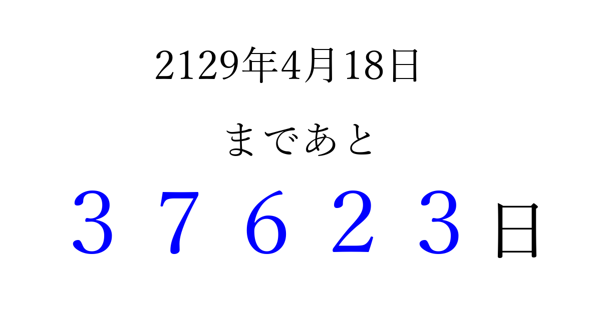 2129年4月18日(月)まで あと 99999 日です 追加すると、トップページからすぐ選べるようになります ※2026/04/15現在の結果です。 最新の状態に更新する ↓シェアして、タイムライン上にカウントダウンを表示しよう!↓ 📤 この結果を共有する Tweet シェア Threads Bluesky 別の日付でカウントダウン 2129年4月のカレンダー このページをブックマークに追加すると、いつでもカウントダウンを確認できます。 (PC: Ctrl+D / Mac: ⌘+D) hitome-notes.comでは以下のページも運営しています。 指定日と期間から日付を計算 | ガチャ確率計算・シミュレーション | プライバシー・ポリシー 運営者:Avocado