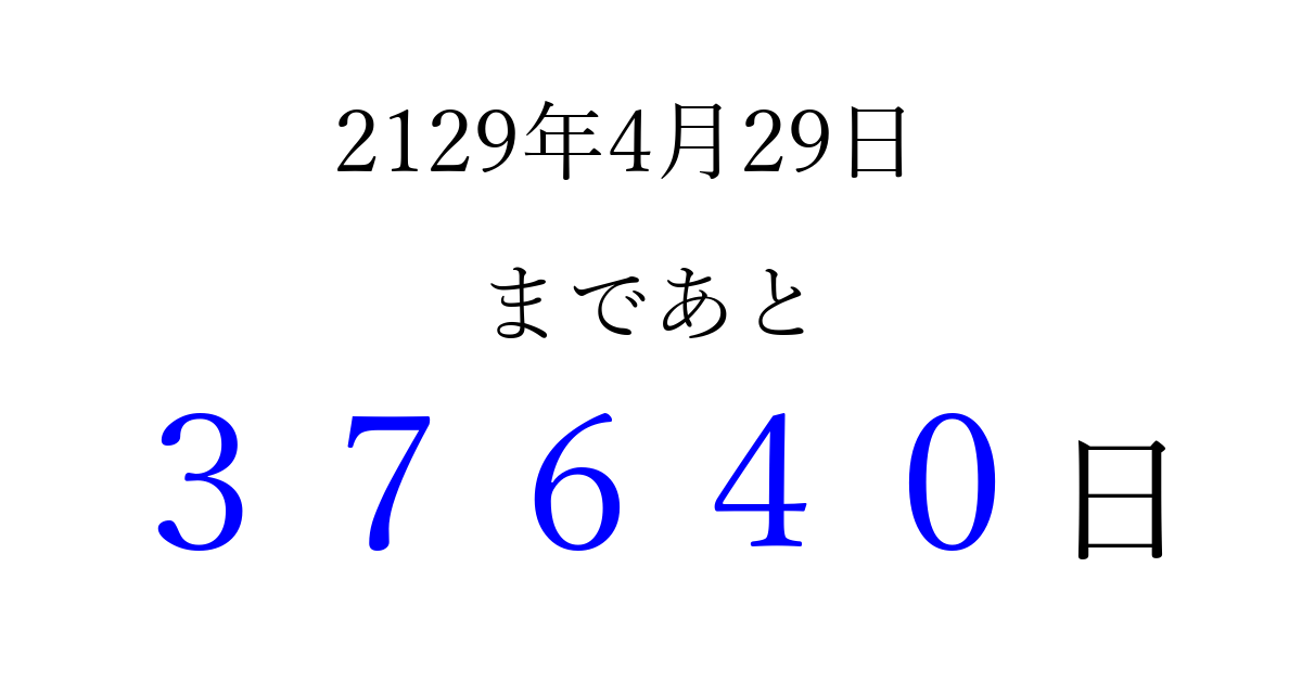 2129年4月29日(金)まで あと 99999 日です 追加すると、トップページからすぐ選べるようになります ※2026/04/09現在の結果です。 最新の状態に更新する ↓シェアして、タイムライン上にカウントダウンを表示しよう!↓ 📤 この結果を共有する Tweet シェア Threads Bluesky 別の日付でカウントダウン 2129年4月のカレンダー このページをブックマークに追加すると、いつでもカウントダウンを確認できます。 (PC: Ctrl+D / Mac: ⌘+D) hitome-notes.comでは以下のページも運営しています。 指定日と期間から日付を計算 | ガチャ確率計算・シミュレーション | プライバシー・ポリシー 運営者:Avocado