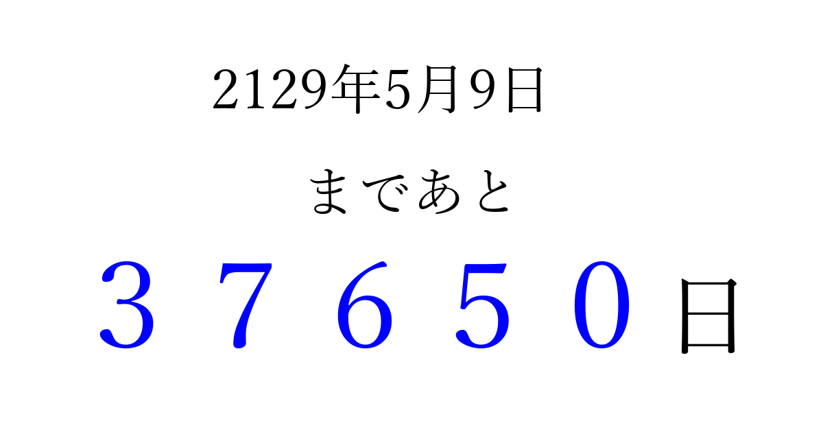2129年5月9日(月)まで あと 99999 日です 追加すると、トップページからすぐ選べるようになります ※2026/04/09現在の結果です。 最新の状態に更新する ↓シェアして、タイムライン上にカウントダウンを表示しよう!↓ 📤 この結果を共有する Tweet シェア Threads Bluesky 別の日付でカウントダウン 2129年5月のカレンダー このページをブックマークに追加すると、いつでもカウントダウンを確認できます。 (PC: Ctrl+D / Mac: ⌘+D) hitome-notes.comでは以下のページも運営しています。 指定日と期間から日付を計算 | ガチャ確率計算・シミュレーション | プライバシー・ポリシー 運営者:Avocado