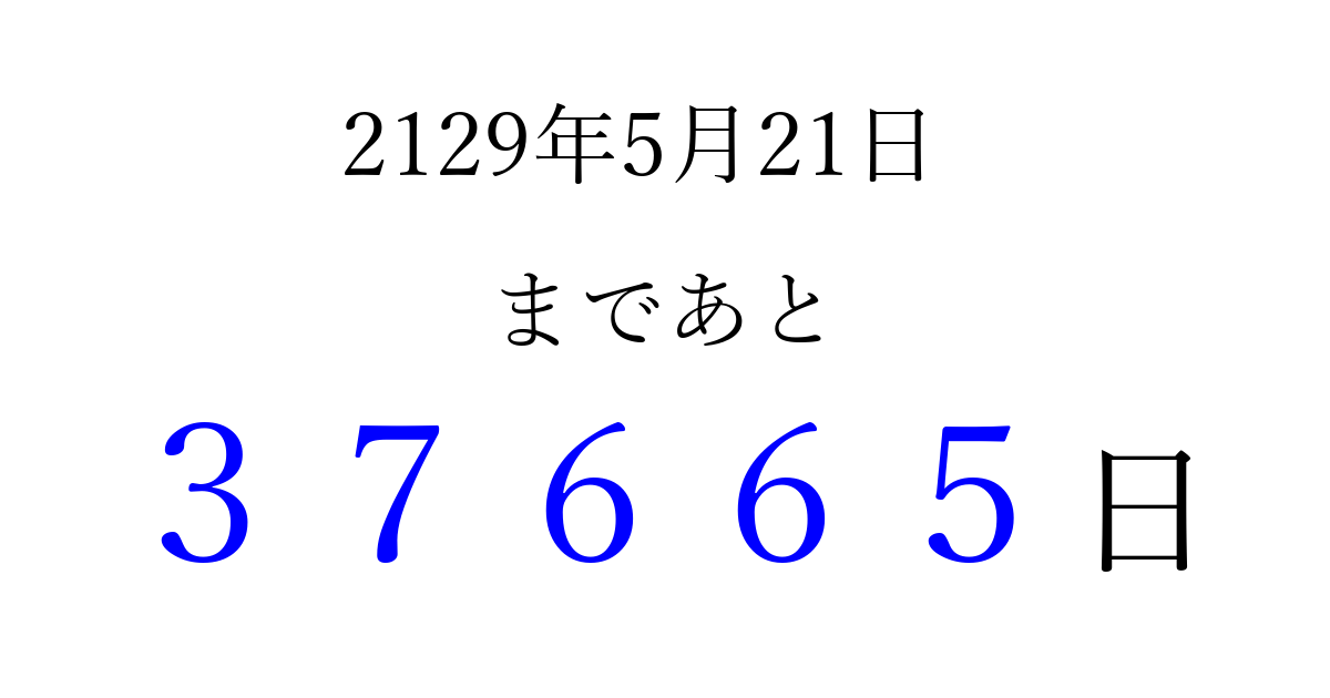 2129年5月21日(土)まで あと 99999 日です 追加すると、トップページからすぐ選べるようになります ※2026/04/06現在の結果です。 最新の状態に更新する ↓シェアして、タイムライン上にカウントダウンを表示しよう!↓ 📤 この結果を共有する Tweet シェア Threads Bluesky 別の日付でカウントダウン 2129年5月のカレンダー このページをブックマークに追加すると、いつでもカウントダウンを確認できます。 (PC: Ctrl+D / Mac: ⌘+D) hitome-notes.comでは以下のページも運営しています。 指定日と期間から日付を計算 | ガチャ確率計算・シミュレーション | プライバシー・ポリシー 運営者:Avocado