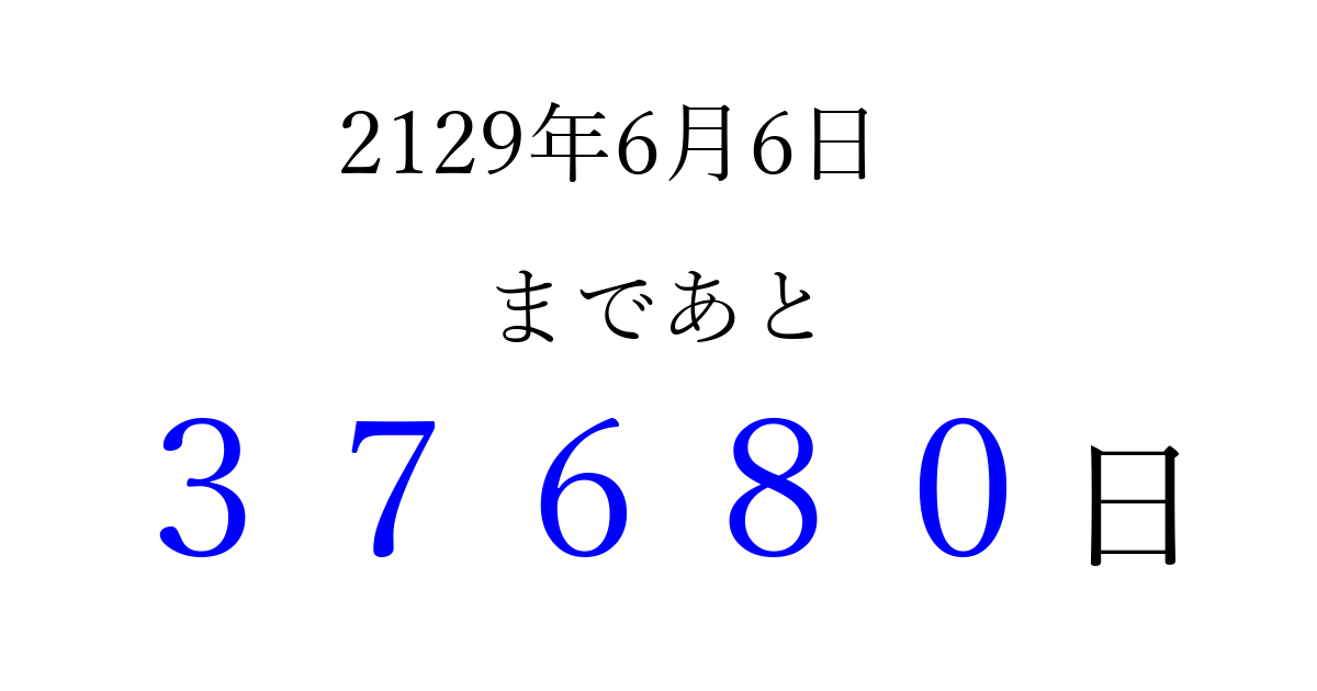 2129年6月6日(月)まで あと 99999 日です 追加すると、トップページからすぐ選べるようになります ※2026/04/07現在の結果です。 最新の状態に更新する ↓シェアして、タイムライン上にカウントダウンを表示しよう!↓ 📤 この結果を共有する Tweet シェア Threads Bluesky 別の日付でカウントダウン 2129年6月のカレンダー このページをブックマークに追加すると、いつでもカウントダウンを確認できます。 (PC: Ctrl+D / Mac: ⌘+D) hitome-notes.comでは以下のページも運営しています。 指定日と期間から日付を計算 | ガチャ確率計算・シミュレーション | プライバシー・ポリシー 運営者:Avocado