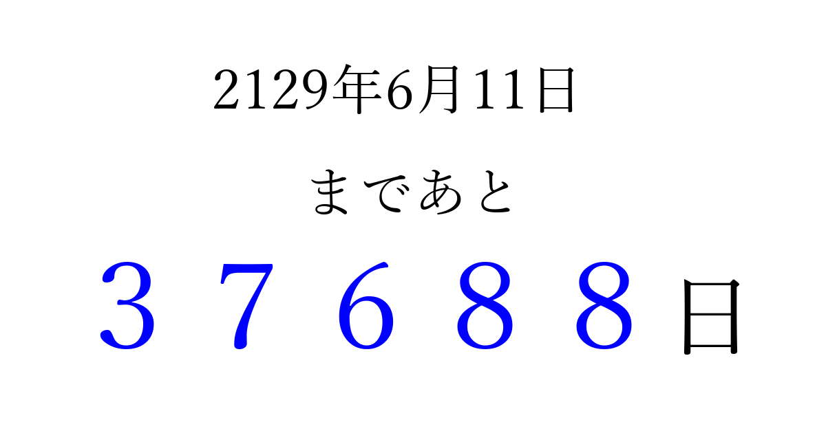 2129年6月11日(土)まで あと 99999 日です 追加すると、トップページからすぐ選べるようになります ※2026/04/04現在の結果です。 最新の状態に更新する ↓シェアして、タイムライン上にカウントダウンを表示しよう!↓ 📤 この結果を共有する Tweet シェア Threads Bluesky 別の日付でカウントダウン 2129年6月のカレンダー このページをブックマークに追加すると、いつでもカウントダウンを確認できます。 (PC: Ctrl+D / Mac: ⌘+D) hitome-notes.comでは以下のページも運営しています。 指定日と期間から日付を計算 | ガチャ確率計算・シミュレーション | プライバシー・ポリシー 運営者:Avocado