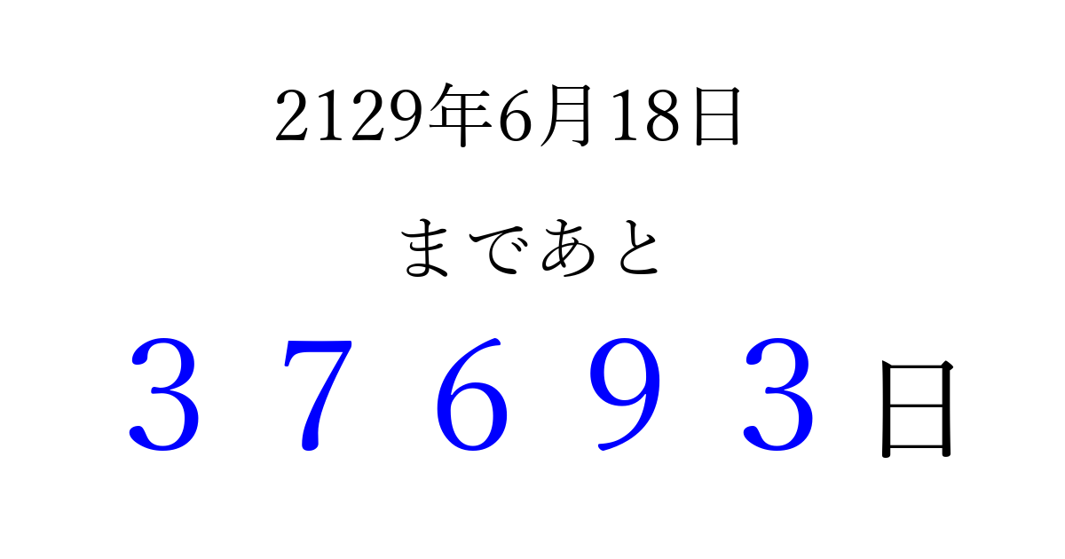 2129年6月18日(土)まで あと 99999 日です 追加すると、トップページからすぐ選べるようになります ※2026/04/06現在の結果です。 最新の状態に更新する ↓シェアして、タイムライン上にカウントダウンを表示しよう!↓ 📤 この結果を共有する Tweet シェア Threads Bluesky 別の日付でカウントダウン 2129年6月のカレンダー このページをブックマークに追加すると、いつでもカウントダウンを確認できます。 (PC: Ctrl+D / Mac: ⌘+D) hitome-notes.comでは以下のページも運営しています。 指定日と期間から日付を計算 | ガチャ確率計算・シミュレーション | プライバシー・ポリシー 運営者:Avocado