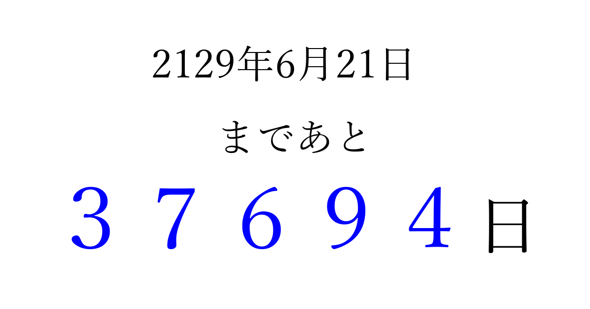 2129年6月21日(火)まで あと 99999 日です 追加すると、トップページからすぐ選べるようになります ※2026/04/08現在の結果です。 最新の状態に更新する ↓シェアして、タイムライン上にカウントダウンを表示しよう!↓ 📤 この結果を共有する Tweet シェア Threads Bluesky 別の日付でカウントダウン 2129年6月のカレンダー このページをブックマークに追加すると、いつでもカウントダウンを確認できます。 (PC: Ctrl+D / Mac: ⌘+D) hitome-notes.comでは以下のページも運営しています。 指定日と期間から日付を計算 | ガチャ確率計算・シミュレーション | プライバシー・ポリシー 運営者:Avocado