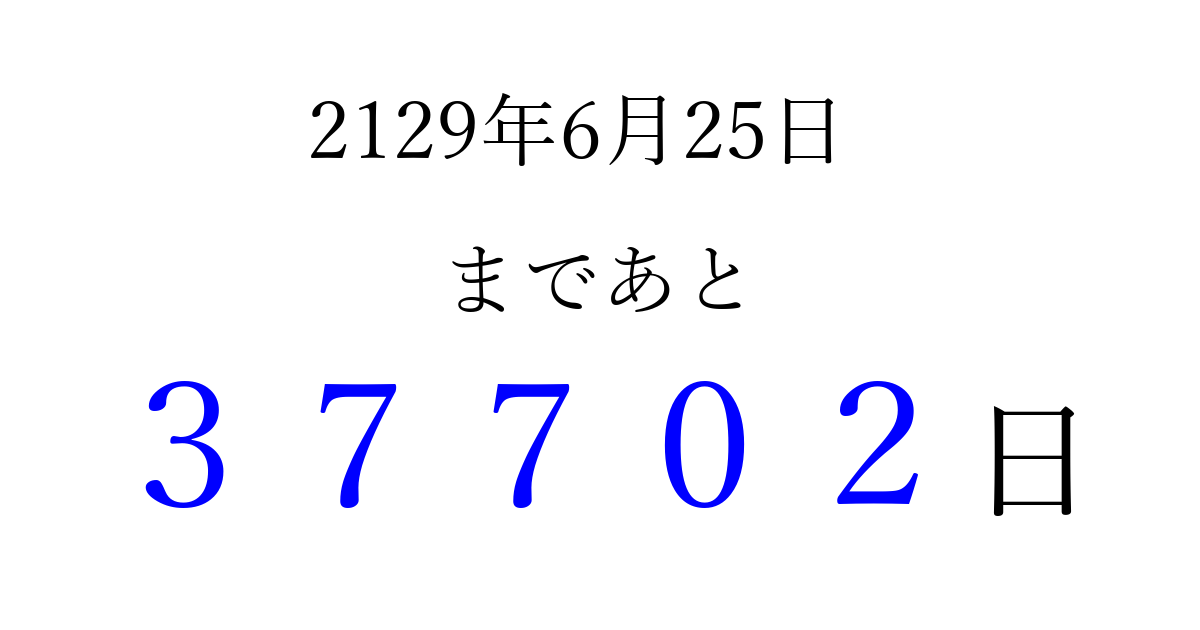 2129年6月25日(土)まで あと 99999 日です 追加すると、トップページからすぐ選べるようになります ※2026/04/04現在の結果です。 最新の状態に更新する ↓シェアして、タイムライン上にカウントダウンを表示しよう!↓ 📤 この結果を共有する Tweet シェア Threads Bluesky 別の日付でカウントダウン 2129年6月のカレンダー このページをブックマークに追加すると、いつでもカウントダウンを確認できます。 (PC: Ctrl+D / Mac: ⌘+D) hitome-notes.comでは以下のページも運営しています。 指定日と期間から日付を計算 | ガチャ確率計算・シミュレーション | プライバシー・ポリシー 運営者:Avocado