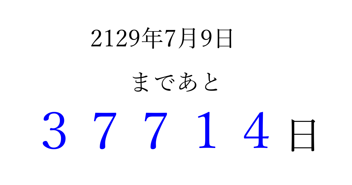2129年7月9日(土)まで あと 99999 日です 追加すると、トップページからすぐ選べるようになります ※2026/04/06現在の結果です。 最新の状態に更新する ↓シェアして、タイムライン上にカウントダウンを表示しよう!↓ 📤 この結果を共有する Tweet シェア Threads Bluesky 別の日付でカウントダウン 2129年7月のカレンダー このページをブックマークに追加すると、いつでもカウントダウンを確認できます。 (PC: Ctrl+D / Mac: ⌘+D) hitome-notes.comでは以下のページも運営しています。 指定日と期間から日付を計算 | ガチャ確率計算・シミュレーション | プライバシー・ポリシー 運営者:Avocado