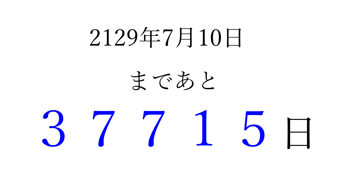 2129年7月10日(日)まで あと 99999 日です 追加すると、トップページからすぐ選べるようになります ※2026/04/06現在の結果です。 最新の状態に更新する ↓シェアして、タイムライン上にカウントダウンを表示しよう!↓ 📤 この結果を共有する Tweet シェア Threads Bluesky 別の日付でカウントダウン 2129年7月のカレンダー このページをブックマークに追加すると、いつでもカウントダウンを確認できます。 (PC: Ctrl+D / Mac: ⌘+D) hitome-notes.comでは以下のページも運営しています。 指定日と期間から日付を計算 | ガチャ確率計算・シミュレーション | プライバシー・ポリシー 運営者:Avocado