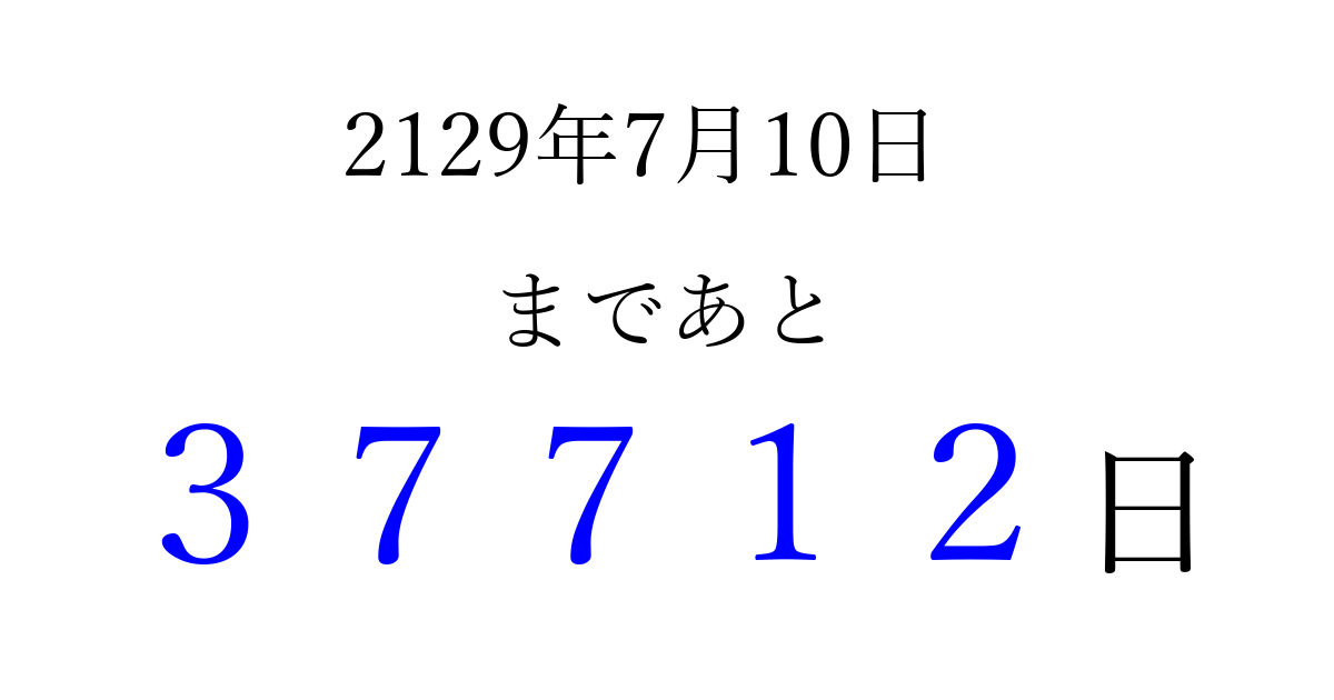 2129年7月10日(日)まで あと 99999 日です 追加すると、トップページからすぐ選べるようになります ※2026/04/09現在の結果です。 最新の状態に更新する ↓シェアして、タイムライン上にカウントダウンを表示しよう!↓ 📤 この結果を共有する Tweet シェア Threads Bluesky 別の日付でカウントダウン 2129年7月のカレンダー このページをブックマークに追加すると、いつでもカウントダウンを確認できます。 (PC: Ctrl+D / Mac: ⌘+D) hitome-notes.comでは以下のページも運営しています。 指定日と期間から日付を計算 | ガチャ確率計算・シミュレーション | プライバシー・ポリシー 運営者:Avocado