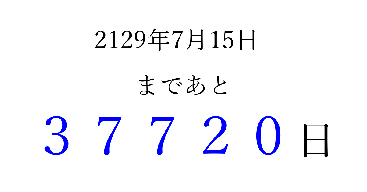 2129年7月15日(金)まで あと 99999 日です 追加すると、トップページからすぐ選べるようになります ※2026/04/06現在の結果です。 最新の状態に更新する ↓シェアして、タイムライン上にカウントダウンを表示しよう!↓ 📤 この結果を共有する Tweet シェア Threads Bluesky 別の日付でカウントダウン 2129年7月のカレンダー このページをブックマークに追加すると、いつでもカウントダウンを確認できます。 (PC: Ctrl+D / Mac: ⌘+D) hitome-notes.comでは以下のページも運営しています。 指定日と期間から日付を計算 | ガチャ確率計算・シミュレーション | プライバシー・ポリシー 運営者:Avocado