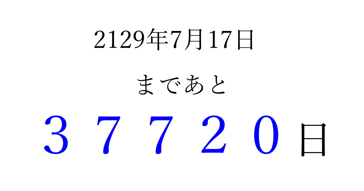 2129年7月17日(日)まで あと 99999 日です 追加すると、トップページからすぐ選べるようになります ※2026/04/08現在の結果です。 最新の状態に更新する ↓シェアして、タイムライン上にカウントダウンを表示しよう!↓ 📤 この結果を共有する Tweet シェア Threads Bluesky 別の日付でカウントダウン 2129年7月のカレンダー このページをブックマークに追加すると、いつでもカウントダウンを確認できます。 (PC: Ctrl+D / Mac: ⌘+D) hitome-notes.comでは以下のページも運営しています。 指定日と期間から日付を計算 | ガチャ確率計算・シミュレーション | プライバシー・ポリシー 運営者:Avocado