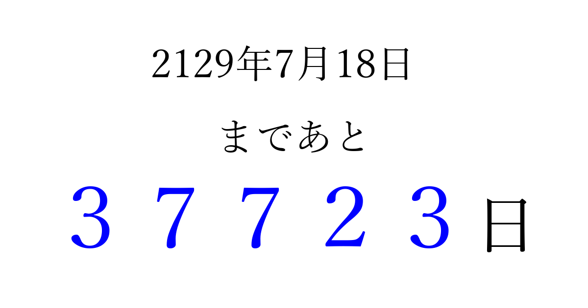 2129年7月18日(月)まで あと 99999 日です 追加すると、トップページからすぐ選べるようになります ※2026/04/06現在の結果です。 最新の状態に更新する ↓シェアして、タイムライン上にカウントダウンを表示しよう!↓ 📤 この結果を共有する Tweet シェア Threads Bluesky 別の日付でカウントダウン 2129年7月のカレンダー このページをブックマークに追加すると、いつでもカウントダウンを確認できます。 (PC: Ctrl+D / Mac: ⌘+D) hitome-notes.comでは以下のページも運営しています。 指定日と期間から日付を計算 | ガチャ確率計算・シミュレーション | プライバシー・ポリシー 運営者:Avocado