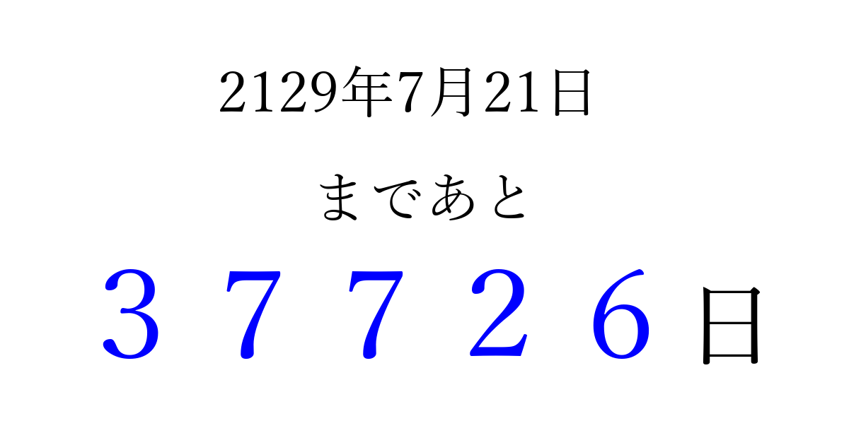 2129年7月21日(木)まで あと 99999 日です 追加すると、トップページからすぐ選べるようになります ※2026/04/06現在の結果です。 最新の状態に更新する ↓シェアして、タイムライン上にカウントダウンを表示しよう!↓ 📤 この結果を共有する Tweet シェア Threads Bluesky 別の日付でカウントダウン 2129年7月のカレンダー このページをブックマークに追加すると、いつでもカウントダウンを確認できます。 (PC: Ctrl+D / Mac: ⌘+D) hitome-notes.comでは以下のページも運営しています。 指定日と期間から日付を計算 | ガチャ確率計算・シミュレーション | プライバシー・ポリシー 運営者:Avocado