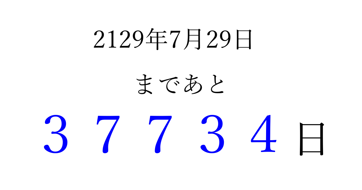 2129年7月29日(金)まで あと 99999 日です 追加すると、トップページからすぐ選べるようになります ※2026/04/06現在の結果です。 最新の状態に更新する ↓シェアして、タイムライン上にカウントダウンを表示しよう!↓ 📤 この結果を共有する Tweet シェア Threads Bluesky 別の日付でカウントダウン 2129年7月のカレンダー このページをブックマークに追加すると、いつでもカウントダウンを確認できます。 (PC: Ctrl+D / Mac: ⌘+D) hitome-notes.comでは以下のページも運営しています。 指定日と期間から日付を計算 | ガチャ確率計算・シミュレーション | プライバシー・ポリシー 運営者:Avocado