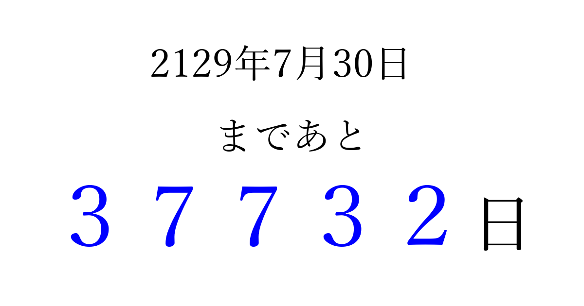 2129年7月30日(土)まで あと 99999 日です 追加すると、トップページからすぐ選べるようになります ※2026/04/09現在の結果です。 最新の状態に更新する ↓シェアして、タイムライン上にカウントダウンを表示しよう!↓ 📤 この結果を共有する Tweet シェア Threads Bluesky 別の日付でカウントダウン 2129年7月のカレンダー このページをブックマークに追加すると、いつでもカウントダウンを確認できます。 (PC: Ctrl+D / Mac: ⌘+D) hitome-notes.comでは以下のページも運営しています。 指定日と期間から日付を計算 | ガチャ確率計算・シミュレーション | プライバシー・ポリシー 運営者:Avocado