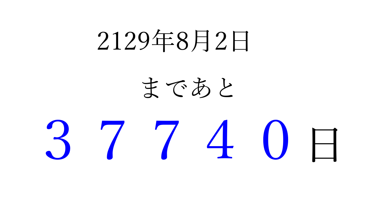 2129年8月2日(火)まで あと 99999 日です 追加すると、トップページからすぐ選べるようになります ※2026/04/04現在の結果です。 最新の状態に更新する ↓シェアして、タイムライン上にカウントダウンを表示しよう!↓ 📤 この結果を共有する Tweet シェア Threads Bluesky 別の日付でカウントダウン 2129年8月のカレンダー このページをブックマークに追加すると、いつでもカウントダウンを確認できます。 (PC: Ctrl+D / Mac: ⌘+D) hitome-notes.comでは以下のページも運営しています。 指定日と期間から日付を計算 | ガチャ確率計算・シミュレーション | プライバシー・ポリシー 運営者:Avocado