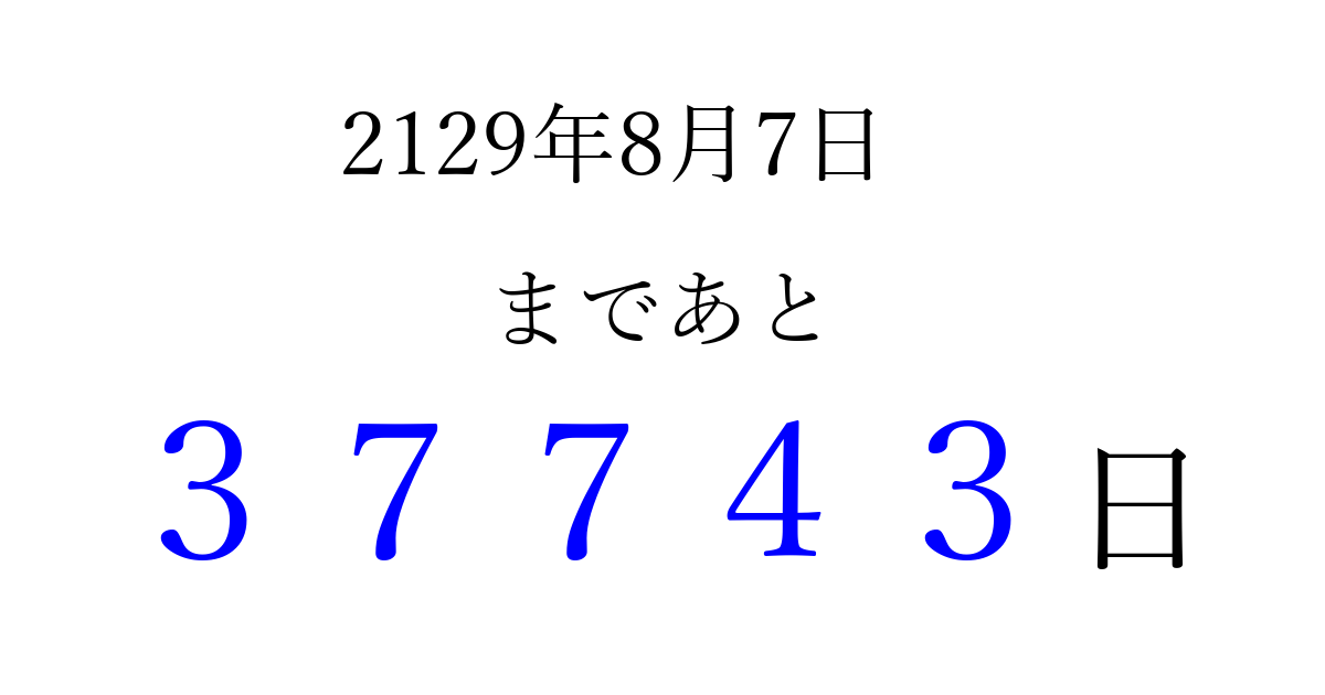 2129年8月7日(日)まで あと 99999 日です 追加すると、トップページからすぐ選べるようになります ※2026/04/06現在の結果です。 最新の状態に更新する ↓シェアして、タイムライン上にカウントダウンを表示しよう!↓ 📤 この結果を共有する Tweet シェア Threads Bluesky 別の日付でカウントダウン 2129年8月のカレンダー このページをブックマークに追加すると、いつでもカウントダウンを確認できます。 (PC: Ctrl+D / Mac: ⌘+D) hitome-notes.comでは以下のページも運営しています。 指定日と期間から日付を計算 | ガチャ確率計算・シミュレーション | プライバシー・ポリシー 運営者:Avocado