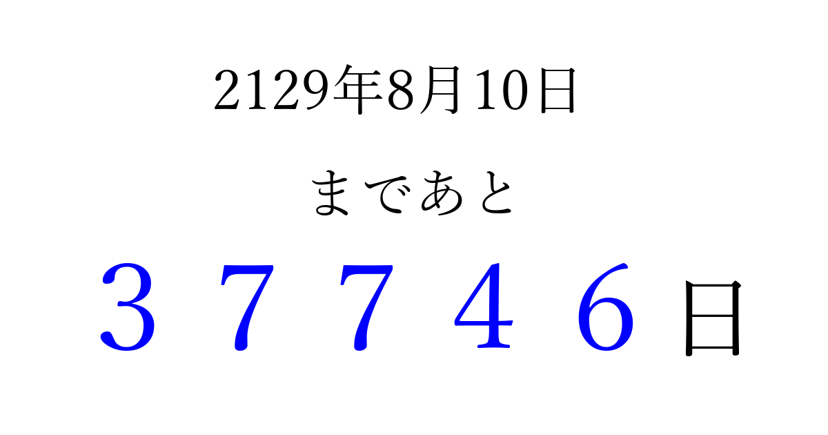 2129年8月10日(水)まで あと 99999 日です 追加すると、トップページからすぐ選べるようになります ※2026/04/06現在の結果です。 最新の状態に更新する ↓シェアして、タイムライン上にカウントダウンを表示しよう!↓ 📤 この結果を共有する Tweet シェア Threads Bluesky 別の日付でカウントダウン 2129年8月のカレンダー このページをブックマークに追加すると、いつでもカウントダウンを確認できます。 (PC: Ctrl+D / Mac: ⌘+D) hitome-notes.comでは以下のページも運営しています。 指定日と期間から日付を計算 | ガチャ確率計算・シミュレーション | プライバシー・ポリシー 運営者:Avocado