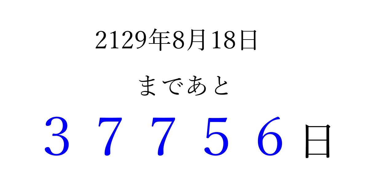 2129年8月18日(木)まで あと 99999 日です 追加すると、トップページからすぐ選べるようになります ※2026/04/04現在の結果です。 最新の状態に更新する ↓シェアして、タイムライン上にカウントダウンを表示しよう!↓ 📤 この結果を共有する Tweet シェア Threads Bluesky 別の日付でカウントダウン 2129年8月のカレンダー このページをブックマークに追加すると、いつでもカウントダウンを確認できます。 (PC: Ctrl+D / Mac: ⌘+D) hitome-notes.comでは以下のページも運営しています。 指定日と期間から日付を計算 | ガチャ確率計算・シミュレーション | プライバシー・ポリシー 運営者:Avocado