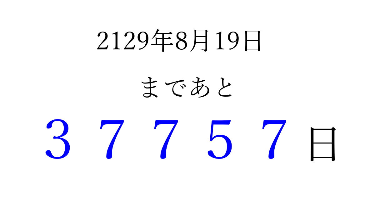 2129年8月19日(金)まで あと 99999 日です 追加すると、トップページからすぐ選べるようになります ※2026/04/04現在の結果です。 最新の状態に更新する ↓シェアして、タイムライン上にカウントダウンを表示しよう!↓ 📤 この結果を共有する Tweet シェア Threads Bluesky 別の日付でカウントダウン 2129年8月のカレンダー このページをブックマークに追加すると、いつでもカウントダウンを確認できます。 (PC: Ctrl+D / Mac: ⌘+D) hitome-notes.comでは以下のページも運営しています。 指定日と期間から日付を計算 | ガチャ確率計算・シミュレーション | プライバシー・ポリシー 運営者:Avocado