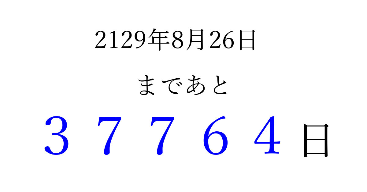 2129年8月26日(金)まで あと 99999 日です 追加すると、トップページからすぐ選べるようになります ※2026/04/04現在の結果です。 最新の状態に更新する ↓シェアして、タイムライン上にカウントダウンを表示しよう!↓ 📤 この結果を共有する Tweet シェア Threads Bluesky 別の日付でカウントダウン 2129年8月のカレンダー このページをブックマークに追加すると、いつでもカウントダウンを確認できます。 (PC: Ctrl+D / Mac: ⌘+D) hitome-notes.comでは以下のページも運営しています。 指定日と期間から日付を計算 | ガチャ確率計算・シミュレーション | プライバシー・ポリシー 運営者:Avocado