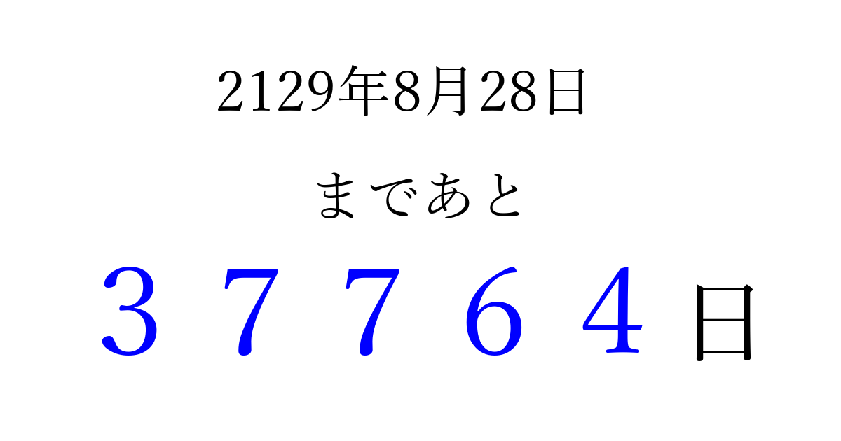 2129年8月28日(日)まで あと 99999 日です 追加すると、トップページからすぐ選べるようになります ※2026/04/06現在の結果です。 最新の状態に更新する ↓シェアして、タイムライン上にカウントダウンを表示しよう!↓ 📤 この結果を共有する Tweet シェア Threads Bluesky 別の日付でカウントダウン 2129年8月のカレンダー このページをブックマークに追加すると、いつでもカウントダウンを確認できます。 (PC: Ctrl+D / Mac: ⌘+D) hitome-notes.comでは以下のページも運営しています。 指定日と期間から日付を計算 | ガチャ確率計算・シミュレーション | プライバシー・ポリシー 運営者:Avocado