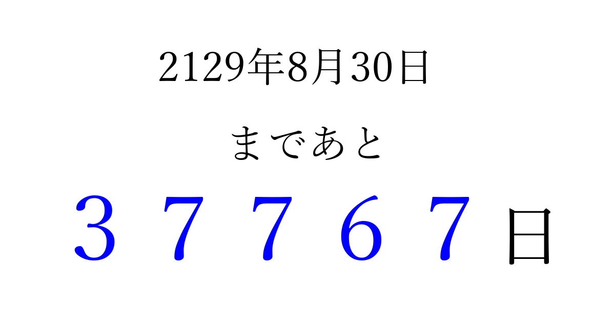 2129年8月30日(火)まで あと 99999 日です 追加すると、トップページからすぐ選べるようになります ※2026/04/05現在の結果です。 最新の状態に更新する ↓シェアして、タイムライン上にカウントダウンを表示しよう!↓ 📤 この結果を共有する Tweet シェア Threads Bluesky 別の日付でカウントダウン 2129年8月のカレンダー このページをブックマークに追加すると、いつでもカウントダウンを確認できます。 (PC: Ctrl+D / Mac: ⌘+D) hitome-notes.comでは以下のページも運営しています。 指定日と期間から日付を計算 | ガチャ確率計算・シミュレーション | プライバシー・ポリシー 運営者:Avocado
