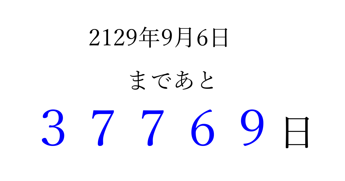 2129年9月6日(火)まで あと 99999 日です 追加すると、トップページからすぐ選べるようになります ※2026/04/10現在の結果です。 最新の状態に更新する ↓シェアして、タイムライン上にカウントダウンを表示しよう!↓ 📤 この結果を共有する Tweet シェア Threads Bluesky 別の日付でカウントダウン 2129年9月のカレンダー このページをブックマークに追加すると、いつでもカウントダウンを確認できます。 (PC: Ctrl+D / Mac: ⌘+D) hitome-notes.comでは以下のページも運営しています。 指定日と期間から日付を計算 | ガチャ確率計算・シミュレーション | プライバシー・ポリシー 運営者:Avocado