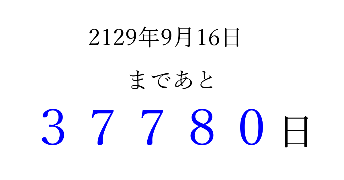 2129年9月16日(金)まで あと 99999 日です 追加すると、トップページからすぐ選べるようになります ※2026/04/09現在の結果です。 最新の状態に更新する ↓シェアして、タイムライン上にカウントダウンを表示しよう!↓ 📤 この結果を共有する Tweet シェア Threads Bluesky 別の日付でカウントダウン 2129年9月のカレンダー このページをブックマークに追加すると、いつでもカウントダウンを確認できます。 (PC: Ctrl+D / Mac: ⌘+D) hitome-notes.comでは以下のページも運営しています。 指定日と期間から日付を計算 | ガチャ確率計算・シミュレーション | プライバシー・ポリシー 運営者:Avocado