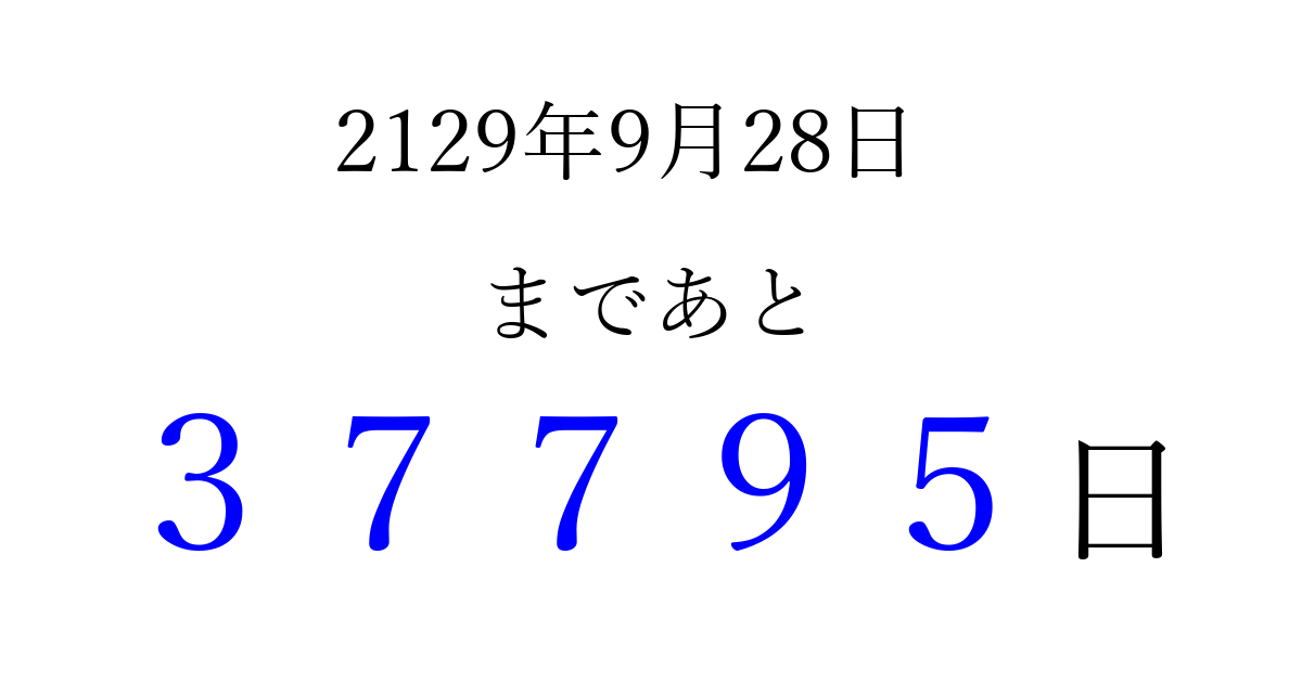 2129年9月28日(水)まで あと 99999 日です 追加すると、トップページからすぐ選べるようになります ※2026/04/06現在の結果です。 最新の状態に更新する ↓シェアして、タイムライン上にカウントダウンを表示しよう!↓ 📤 この結果を共有する Tweet シェア Threads Bluesky 別の日付でカウントダウン 2129年9月のカレンダー このページをブックマークに追加すると、いつでもカウントダウンを確認できます。 (PC: Ctrl+D / Mac: ⌘+D) hitome-notes.comでは以下のページも運営しています。 指定日と期間から日付を計算 | ガチャ確率計算・シミュレーション | プライバシー・ポリシー 運営者:Avocado