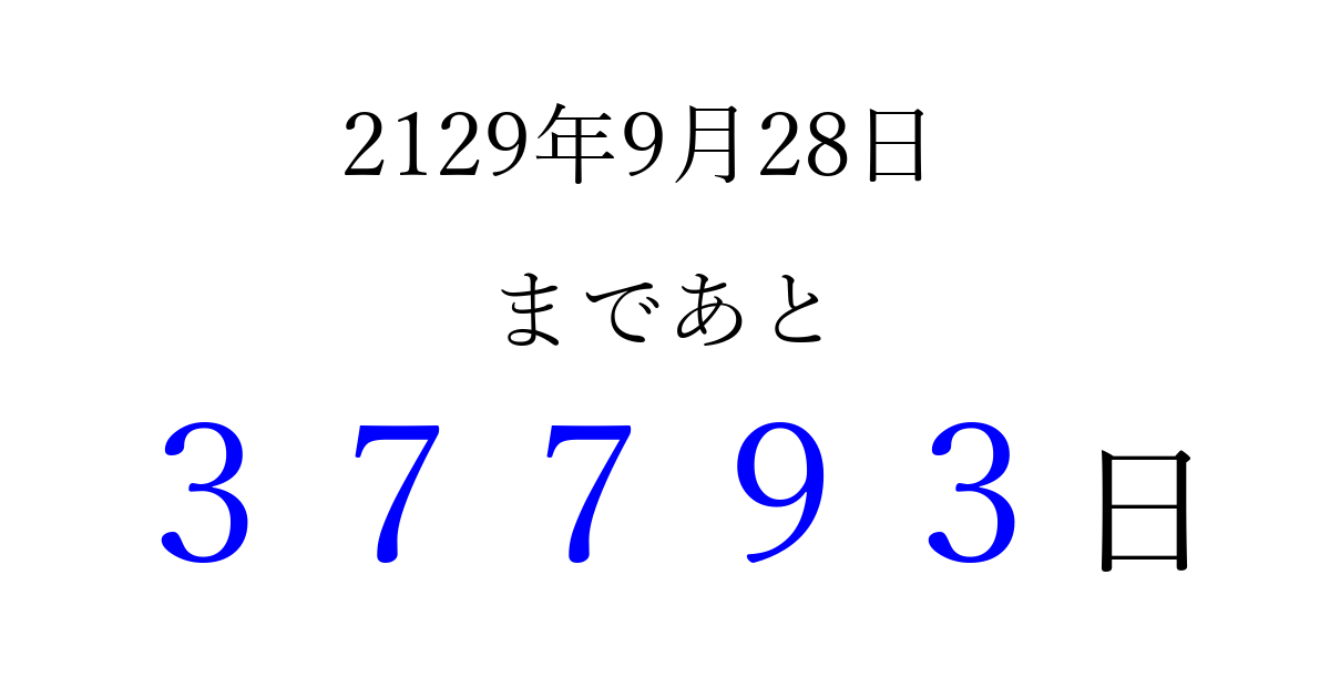 2129年9月28日(水)まで あと 99999 日です 追加すると、トップページからすぐ選べるようになります ※2026/04/08現在の結果です。 最新の状態に更新する ↓シェアして、タイムライン上にカウントダウンを表示しよう!↓ 📤 この結果を共有する Tweet シェア Threads Bluesky 別の日付でカウントダウン 2129年9月のカレンダー このページをブックマークに追加すると、いつでもカウントダウンを確認できます。 (PC: Ctrl+D / Mac: ⌘+D) hitome-notes.comでは以下のページも運営しています。 指定日と期間から日付を計算 | ガチャ確率計算・シミュレーション | プライバシー・ポリシー 運営者:Avocado
