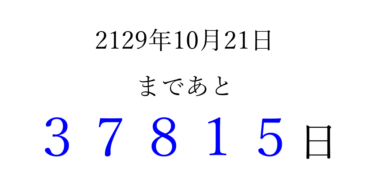 2129年10月21日(金)まで あと 99999 日です 追加すると、トップページからすぐ選べるようになります ※2026/04/09現在の結果です。 最新の状態に更新する ↓シェアして、タイムライン上にカウントダウンを表示しよう!↓ 📤 この結果を共有する Tweet シェア Threads Bluesky 別の日付でカウントダウン 2129年10月のカレンダー このページをブックマークに追加すると、いつでもカウントダウンを確認できます。 (PC: Ctrl+D / Mac: ⌘+D) hitome-notes.comでは以下のページも運営しています。 指定日と期間から日付を計算 | ガチャ確率計算・シミュレーション | プライバシー・ポリシー 運営者:Avocado