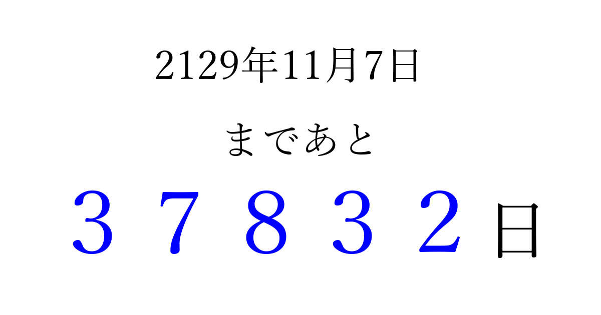 2129年11月7日(月)まで あと 99999 日です 追加すると、トップページからすぐ選べるようになります ※2026/04/09現在の結果です。 最新の状態に更新する ↓シェアして、タイムライン上にカウントダウンを表示しよう!↓ 📤 この結果を共有する Tweet シェア Threads Bluesky 別の日付でカウントダウン 2129年11月のカレンダー このページをブックマークに追加すると、いつでもカウントダウンを確認できます。 (PC: Ctrl+D / Mac: ⌘+D) hitome-notes.comでは以下のページも運営しています。 指定日と期間から日付を計算 | ガチャ確率計算・シミュレーション | プライバシー・ポリシー 運営者:Avocado