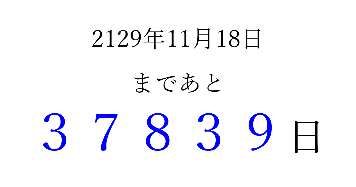 2129年11月18日(金)まで あと 99999 日です 追加すると、トップページからすぐ選べるようになります ※2026/04/13現在の結果です。 最新の状態に更新する ↓シェアして、タイムライン上にカウントダウンを表示しよう!↓ 📤 この結果を共有する Tweet シェア Threads Bluesky 別の日付でカウントダウン 2129年11月のカレンダー このページをブックマークに追加すると、いつでもカウントダウンを確認できます。 (PC: Ctrl+D / Mac: ⌘+D) hitome-notes.comでは以下のページも運営しています。 指定日と期間から日付を計算 | ガチャ確率計算・シミュレーション | プライバシー・ポリシー 運営者:Avocado