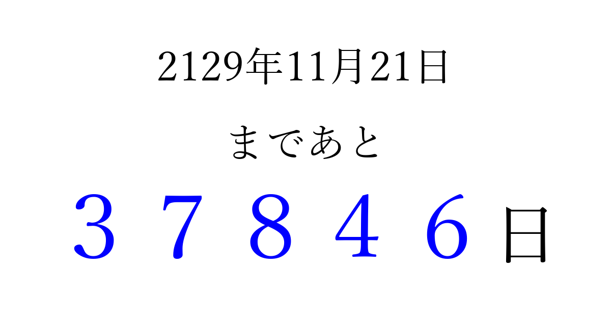 2129年11月21日(月)まで あと 99999 日です 追加すると、トップページからすぐ選べるようになります ※2026/04/09現在の結果です。 最新の状態に更新する ↓シェアして、タイムライン上にカウントダウンを表示しよう!↓ 📤 この結果を共有する Tweet シェア Threads Bluesky 別の日付でカウントダウン 2129年11月のカレンダー このページをブックマークに追加すると、いつでもカウントダウンを確認できます。 (PC: Ctrl+D / Mac: ⌘+D) hitome-notes.comでは以下のページも運営しています。 指定日と期間から日付を計算 | ガチャ確率計算・シミュレーション | プライバシー・ポリシー 運営者:Avocado